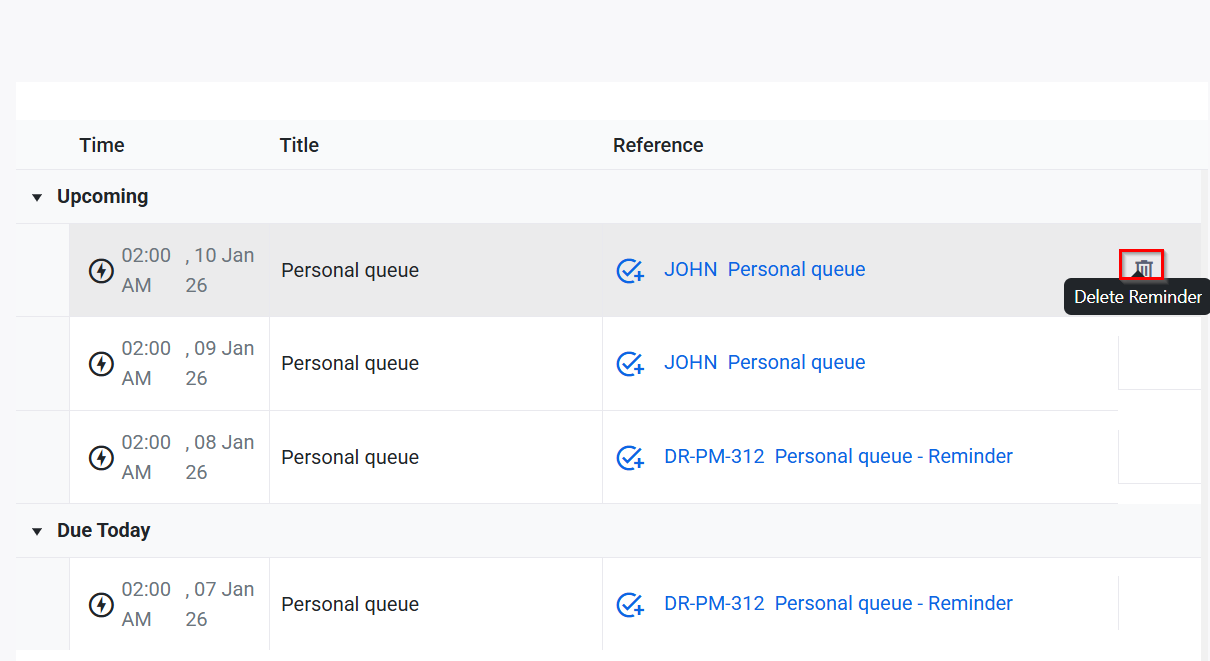- Once the task due date has passed, these reminders will no longer be visible on the Reminders page. However, all upcoming reminders will still appear on the common page.