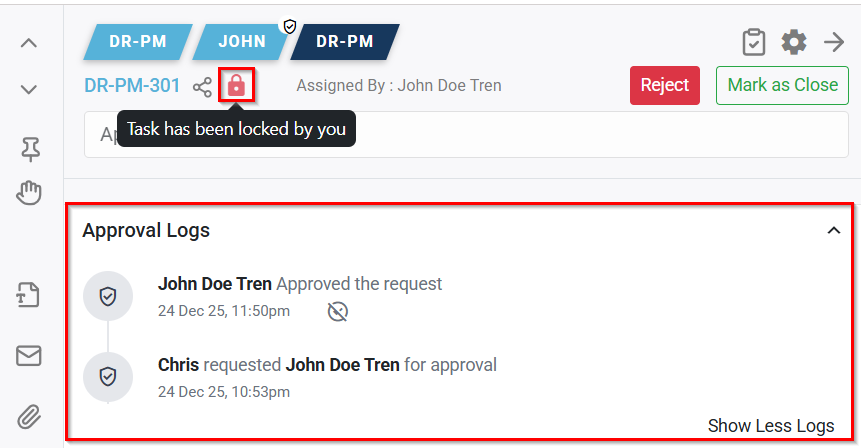 Approvers can include notes and lock tasks during the approval process. Locking a task secures the task name, previous attachments, and description.
