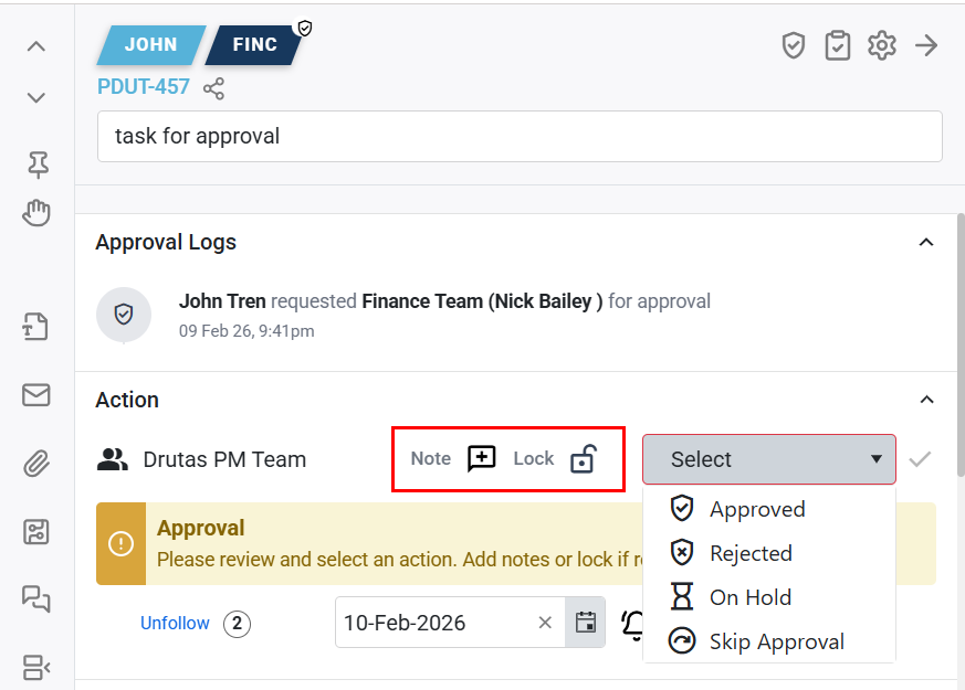 Approvers can include notes and lock tasks during the approval process. Locking a task secures the task name, previous attachments, and description.