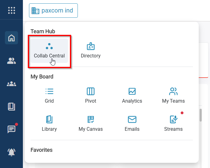Click the Open Apps icon in the top-left corner of the application. A window will appear showing all features—select Collab Central from there.
