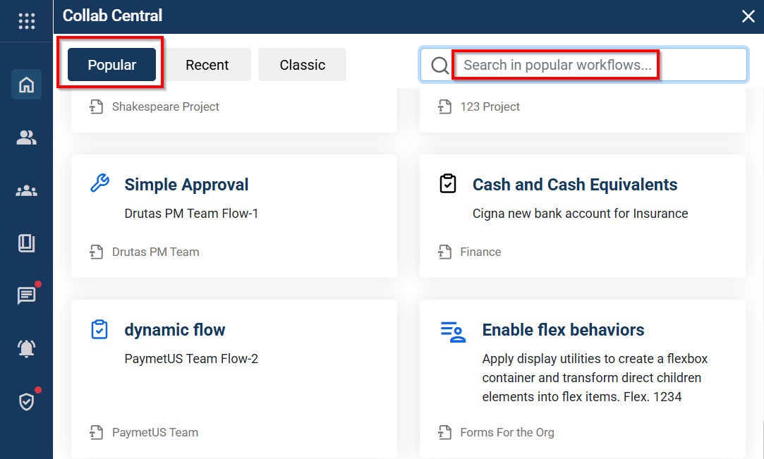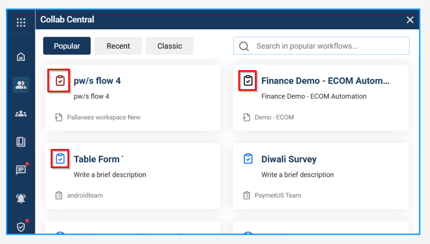 There are three different views available in Collab Central. The default view shows the most popular Workflows/Forms in an organization. You can switch between views to see the most popular, recently accessed, or the classic view of the Collab Central. This flexibility allows you to create tasks with a single click.