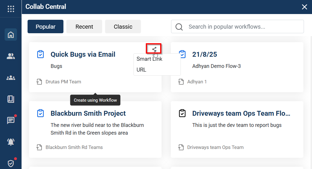 With Collab Central, sharing Workflows/Forms is easier than ever, simply hover over the workflow/Forms and use the highlighted Share icon to copy.