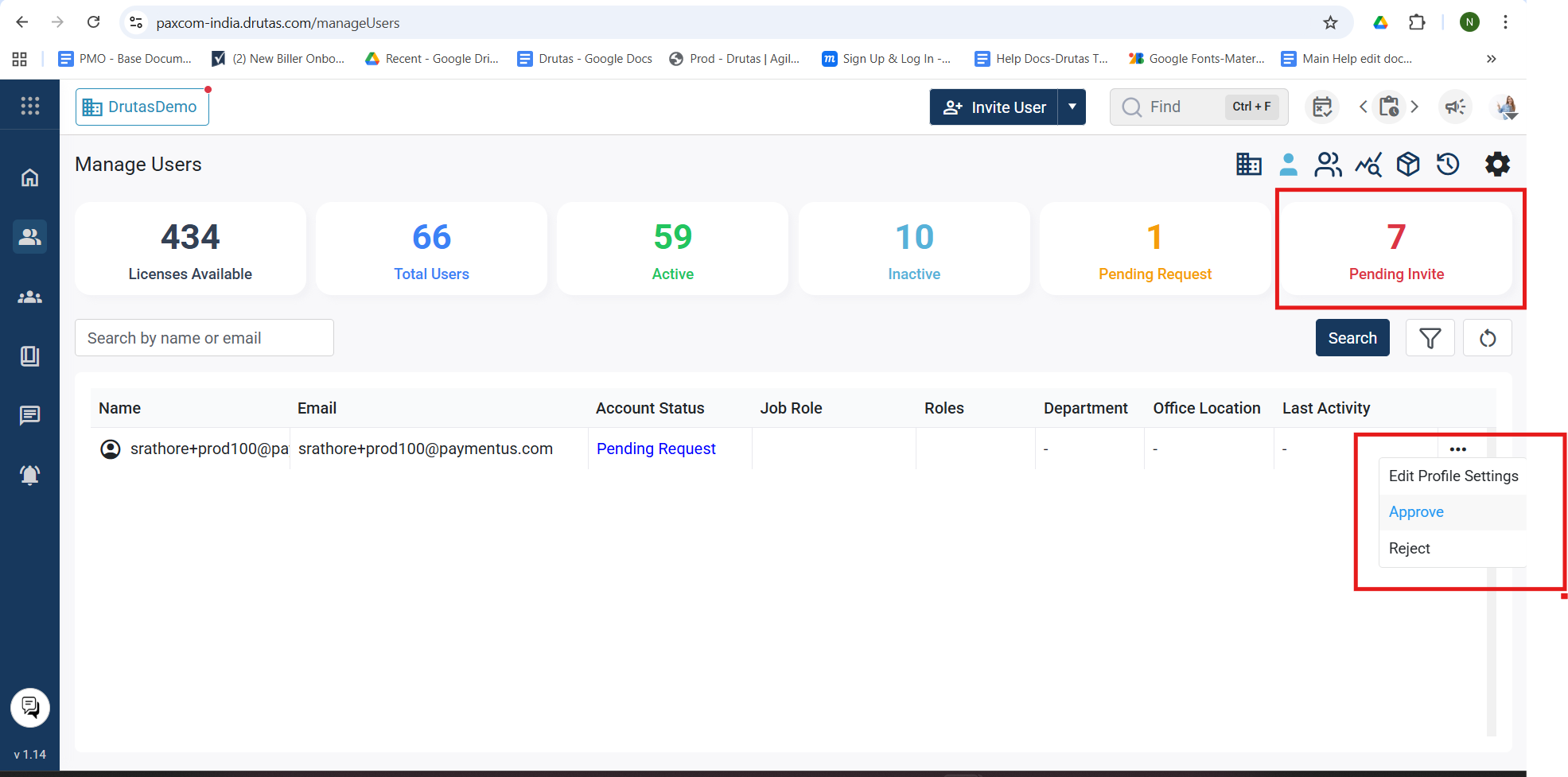 • On the ‘Manage User’ page, go to ‘Pending Request,’ click the three dots next to the user’s name, and choose to approve or reject the user.