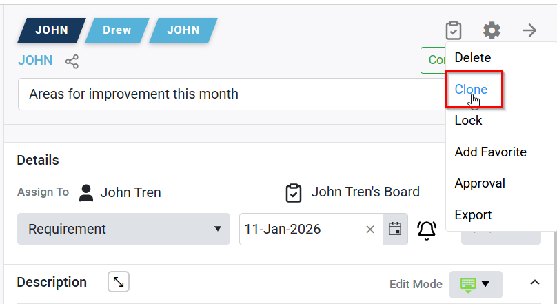 To clone an existing task, open the task, click the settings icon, and choose “Clone.” The cloned task will be assigned to the same team, with you as the assignee, Clone option shown below: