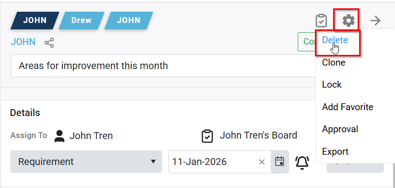 To manage a task, including options to delete, clone, lock, bookmark, or request approval, use the settings gear icon. This icon is located on the right side of the task. Click it to access these settings, as shown below.