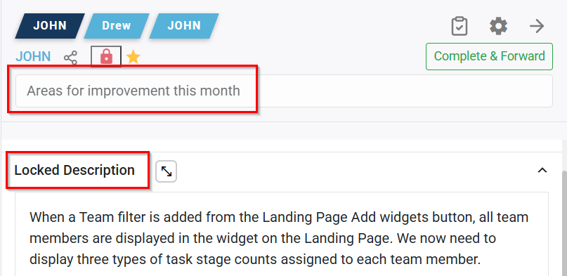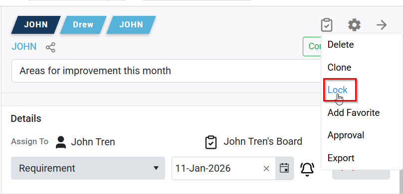 To lock a task, use the lock option from the task sidebar settings. This action locks the task name, description, and opens a new description. A red lock icon will indicate that the task is locked, shown below: