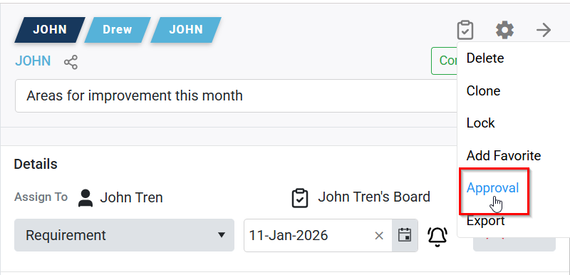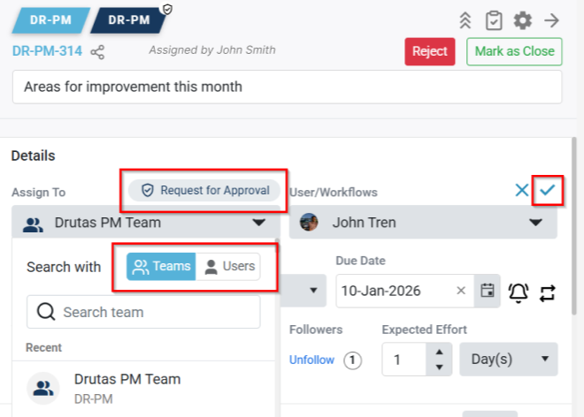- After making a selection, click the tick mark to save the approval. The task sidebar will close, and the task will be automatically sent to the selected approver.
