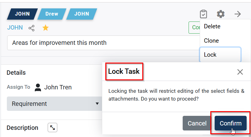 - To lock a task, use the lock option from the task sidebar settings. This action locks the task name, description, and opens a new description.