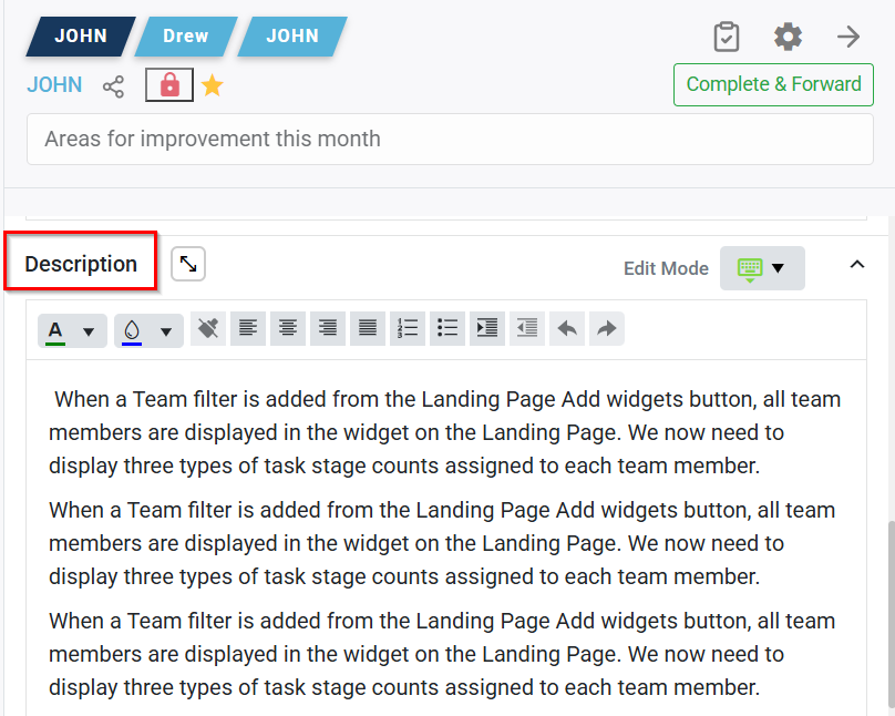 - When a description is locked, a new description field opens for task owners or assignees to add future notes.