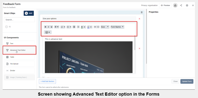 - Advanced Text Editor – Allows creators to add richly formatted text with options like bold, italic, underline, color customization, alignment, bullets, numbering, image insertion/resizing, and hyperlinks. The editor remains fully compatible when forms are embedded externally.