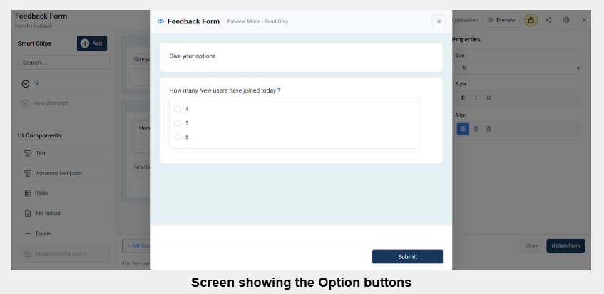 - View as Option Buttons for Dropdowns – Gives creators flexibility in how users select options, either via a standard dropdown or visually as option buttons. It adapts automatically based on option count, ensures consistent previews, applies default selections, and saves data accurately across all modes.