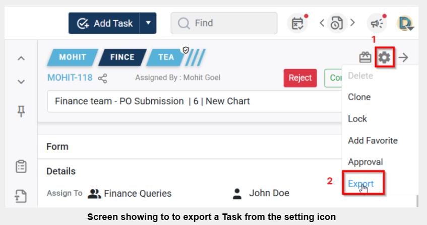 The Task Export to PDF feature allows users to generate well-structured PDF reports of tasks with flexible content selection. Users can choose which sections to include, edit the file name, and export directly from the Task Sidebar. This enhancement streamlines task documentation, sharing, and reporting while reducing manual effort. To export a task PDF open a Task, click the setting icon towards the top right hand side and select the export option.