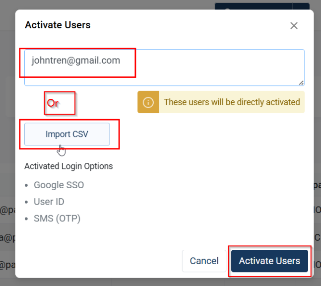 This feature allows Admins to invite users individually or in bulk via csv file upload.The user is activated directly, without the prerequisite to send invite emails. Such users can access the system immediately via Google SSO login.