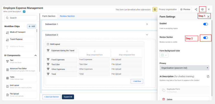 By default, the Review Section is disabled when setting up a form. Creators and reviewers can enable it using the toggle in the Form Settings sidebar. Once the form is submitted, reviewers can edit the Review Section.